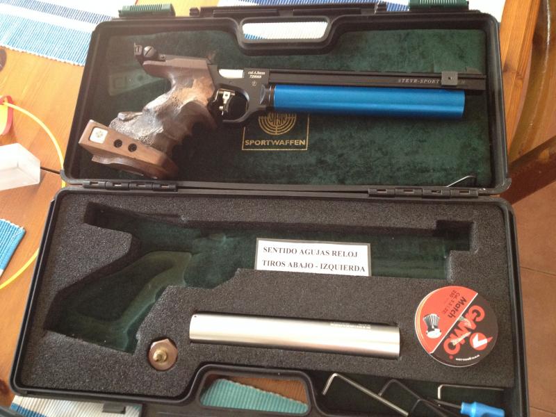 Saludos, vendo Steyr LP10. La pistola es de 2003, lleva una botella caducada en 2013 y otra que caduca en 2021. La empuñadura es una M aunque tiene retoques de pasta. Nada que no se pueda arreglar con un poco de Dremen. Yo ultimamente la he usado con una empuñadura Rink, que conservo para otra Lp10.