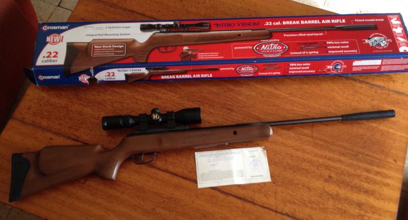 Pongo a la venta mi crosman nitro venom calibre 5,5 funciona perfectamente 1 año de uso, apenas se ah disparado 750 perdigones mas o menos (1 caja y media) tambien añado una mirilla hakko supperB 1,5-6x42mm con anillas utg la cual ah aguantado perfectamente en arma sin descolimarse.