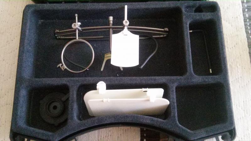 Ahora le toca a las gafas. Son de marca Knobloch. Van en maletín, con llave de ajuste, tapaojos y protectores laterales (hoy en dia no se permiten poner en competiciones, pero tarde o temprano los volverán a introducir), iris, portafiltro y dos filtros (amarillo y púrpura).