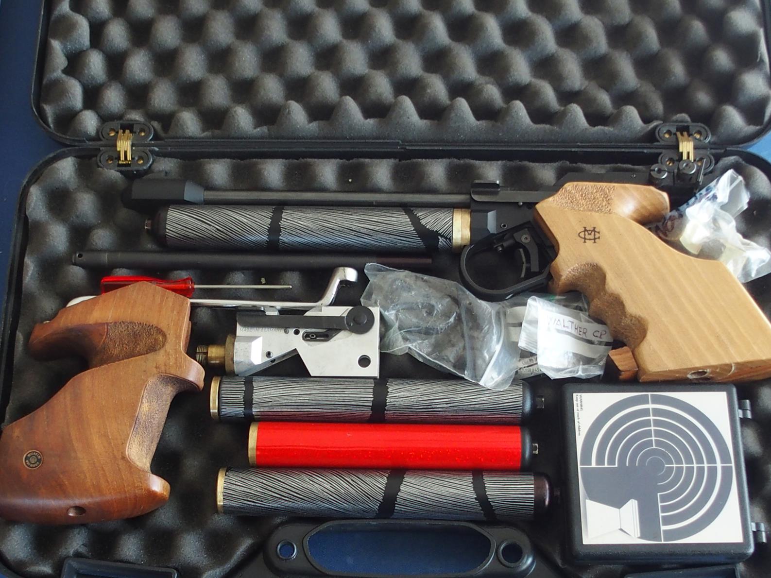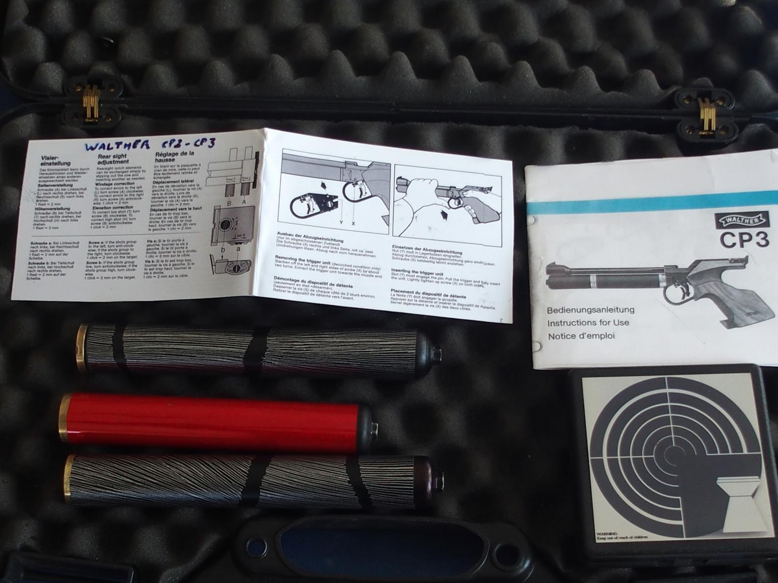 Se trata de una magnifica pistola de la saga de las CP1, CP2 y CP3, en concreto la ultima con una cacha de izquierda tamaño M (soy zurdo) preciosa, fabricada por Hofmann, especial para la competicion a 10 metros. Dispone de un gatillo muy sensible sumamente regulable. En el solido estuche de transporte se incluyen una serie de complementos a cual mas interesante: