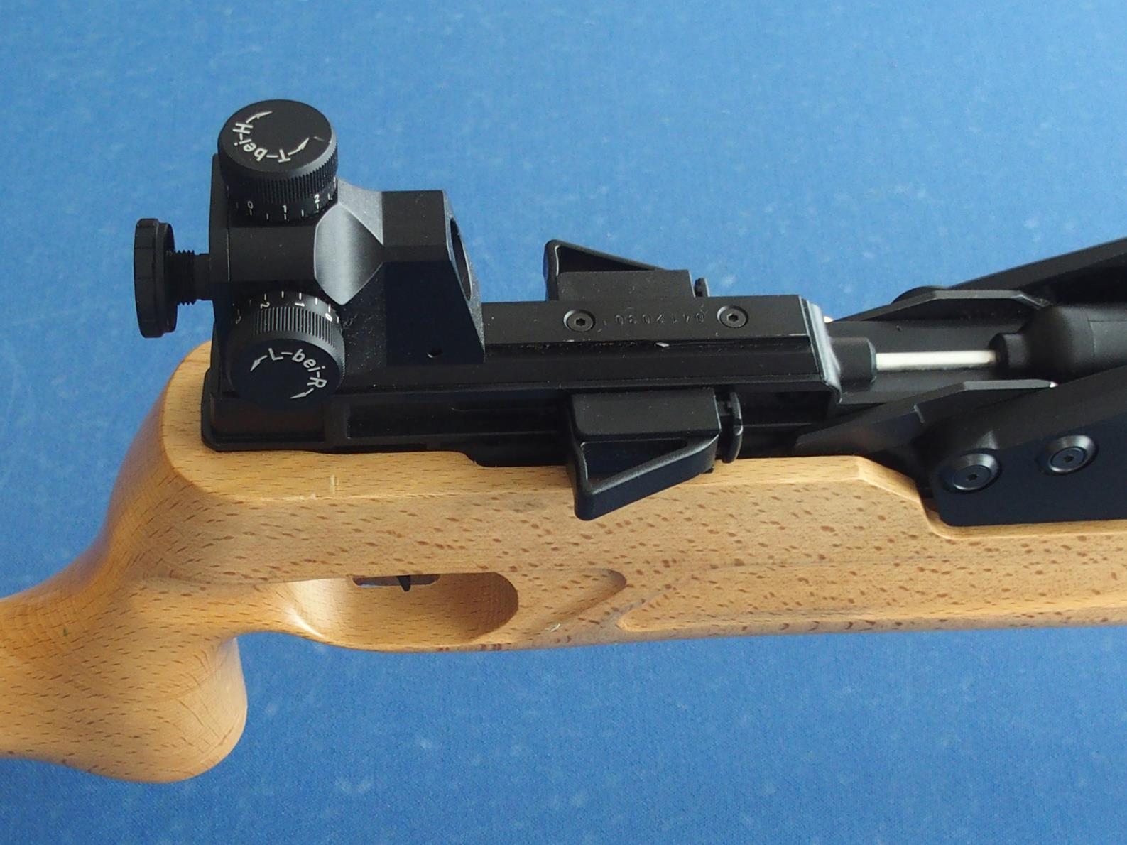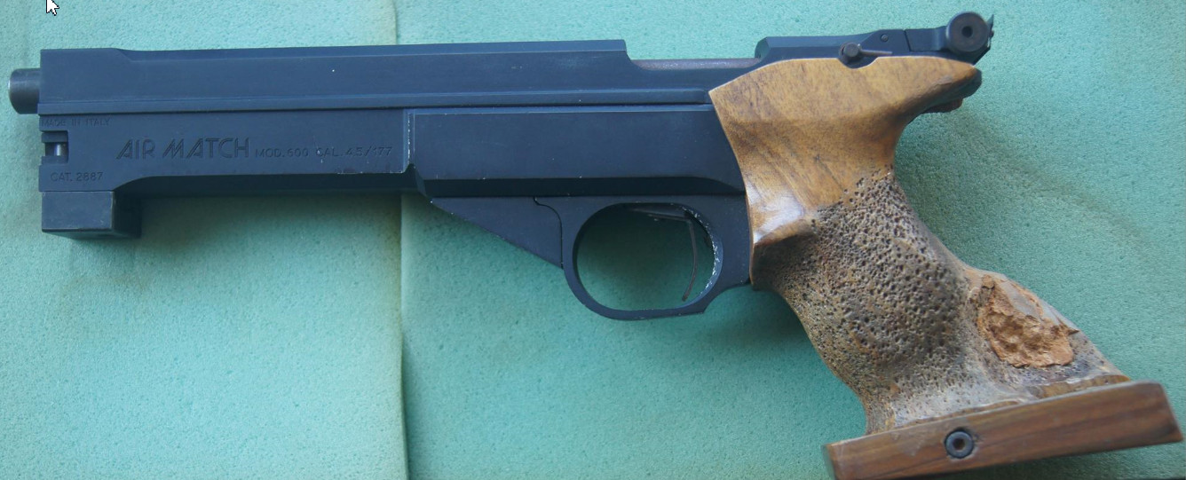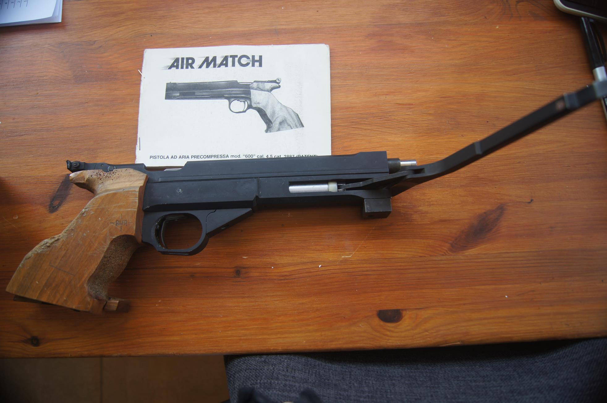 La segunda pieza es una pistola de competición de palanca: Air Match modelo 600 de zurdo. Tambien le falla el mantener la compresión. Tiene un gatillo maravilloso y 2 extensores del punto de mira.