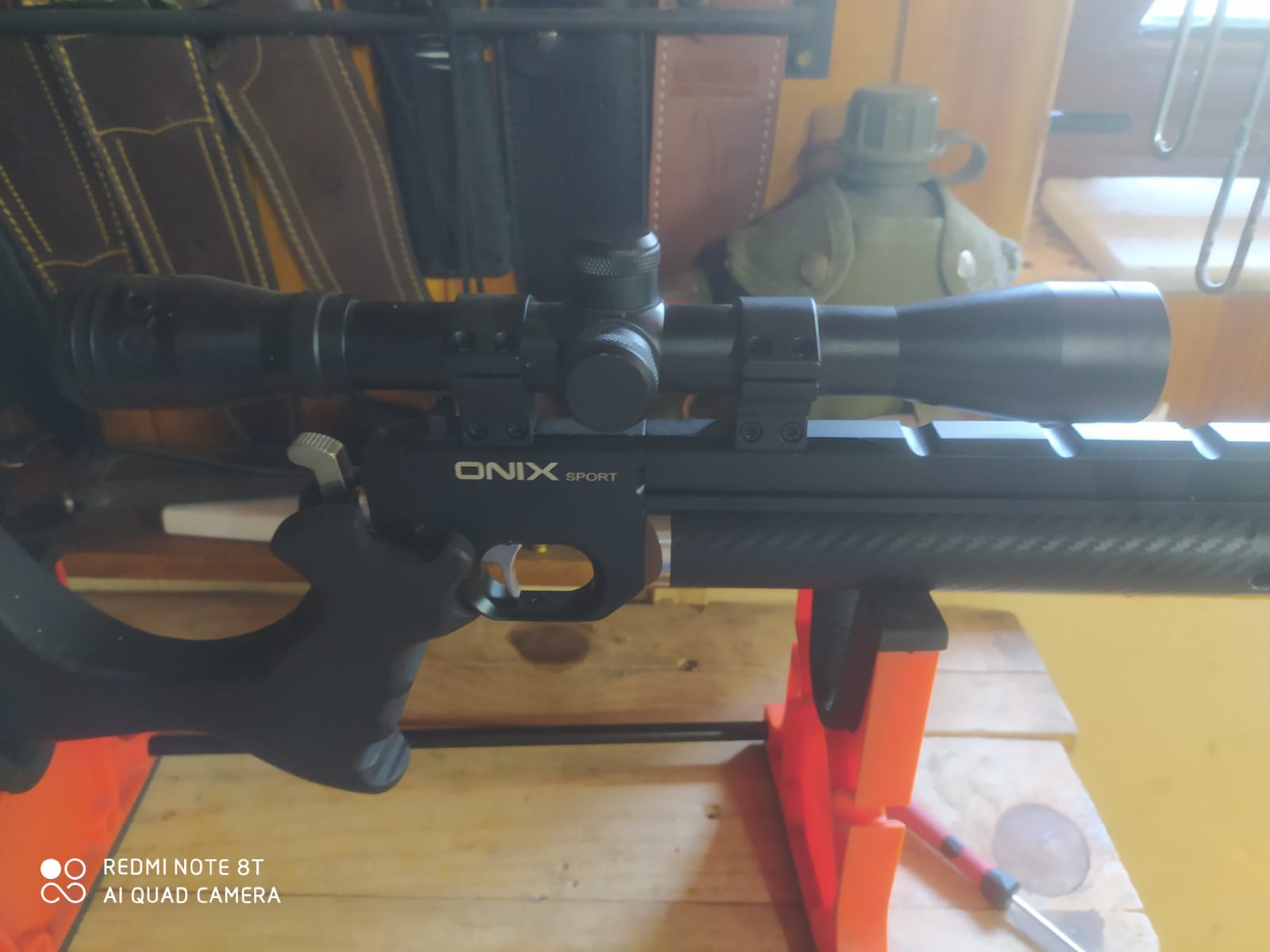 UN AMIGO VENDE pistola onix sport 4,5 con acabado carbono, silenciador, acople para el mismo en aluminio, visor gamo 4x32 ,gatillo afinado, dando 17 J culatin de madera con cachas a medida mas cachas originales
