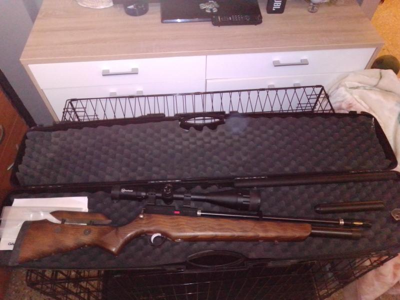 carabina con su funda de cañón dando la apariencia de cañón pesado + la bomba gamo + visor de 9 aumentos como kit de iniciación se deja en 450€.