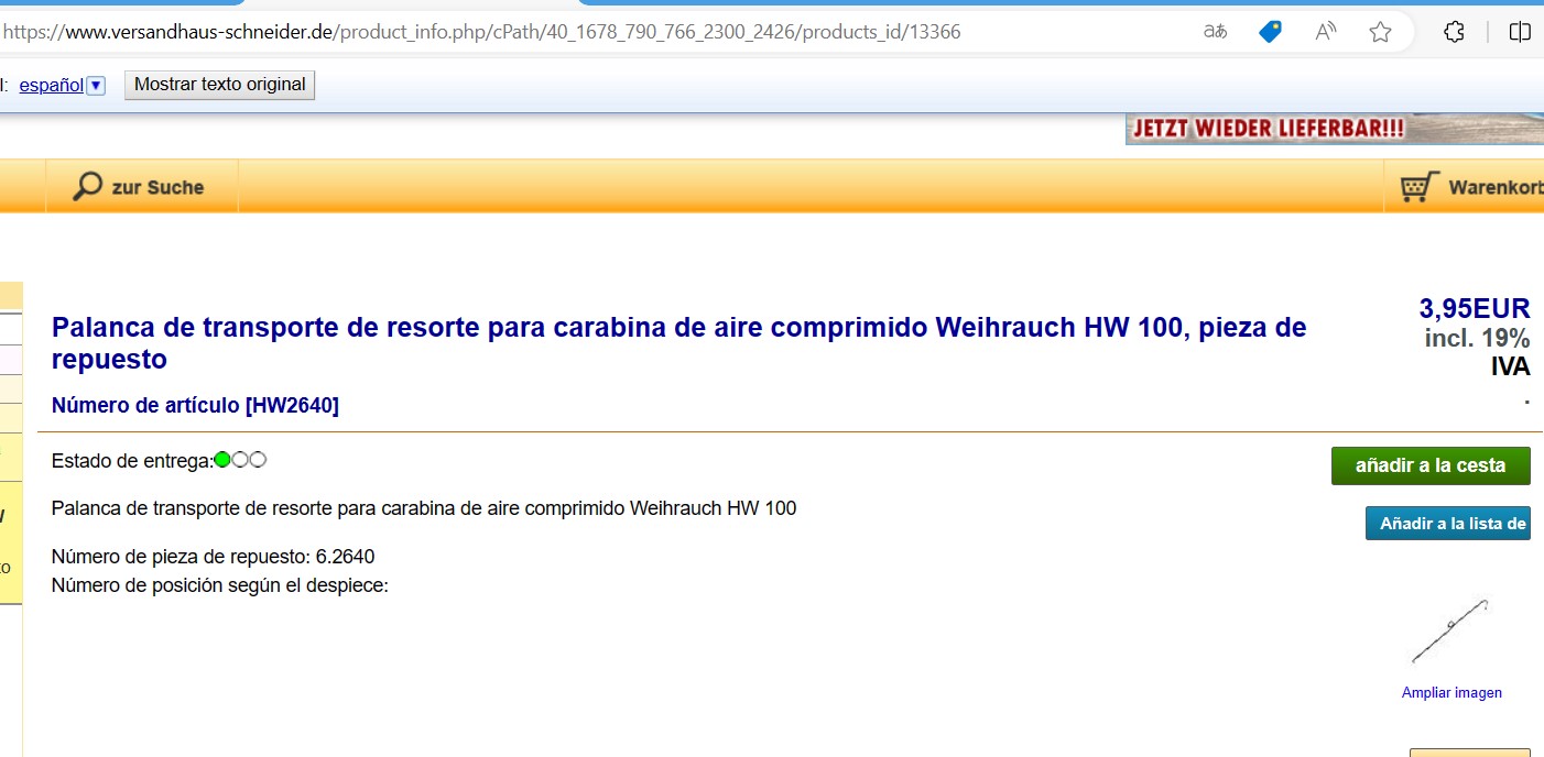 Hola alguien tiene un muelle como este para vender? Es para una Weichrauch HW 100 o donde comprarlo. En la web de Ayala y de Mundilar, no estan