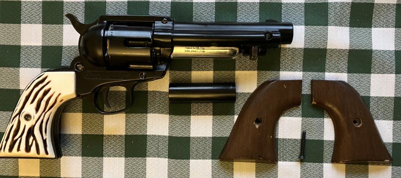 Hola pongo este revólver de acción simple de la marca Crosman, es de la década de los 60-70, accionado por co2 , las cápsulas se alojan debajo del cañón y se oprimen mediante una rosca, se cubren con una tapa quedando acultas. Calibre 5,5 , es completamente metálico con un peso de alrededor de 1 kilo, necesitaría cambiar el sello de la bombona, lleva los 2 juegos de cachas, el estado general es bastante bueno para su antigüedad, el precio 120€. Gracias