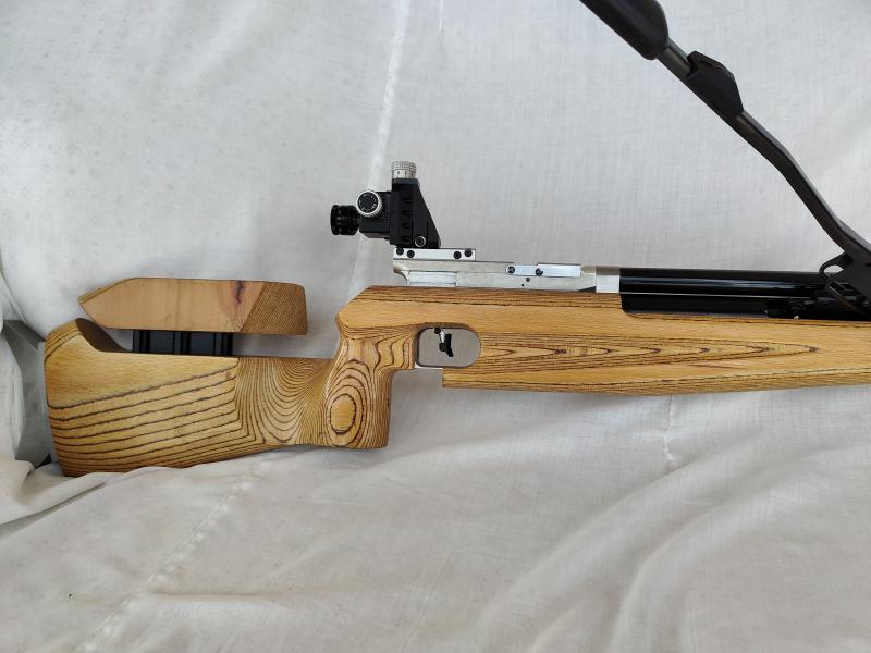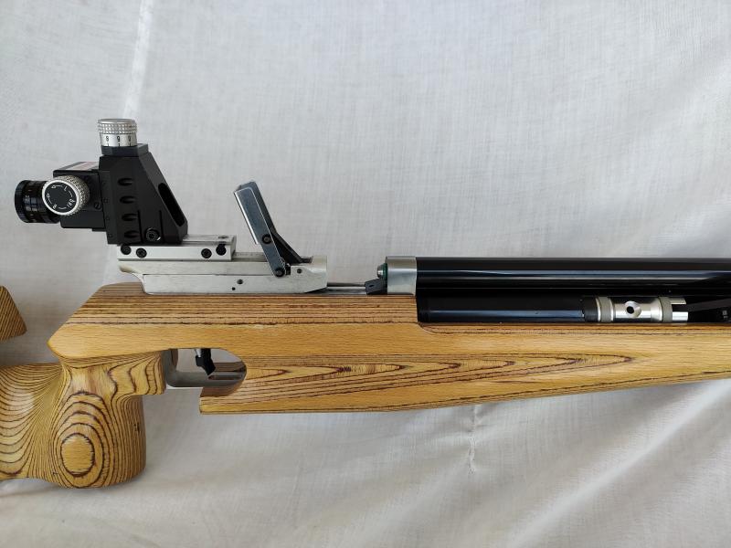 Carabina de competición de 10 metros y calibre 4,5, muy bien conservada. La culata no presenta golpes ni abolladuras el cañón conserva el pavonado perfectamente. La carabina es plenamente funcional; conserva la presión. Lleva un diópter estenopéico Hämerli y rabera de aluminio. Gracias