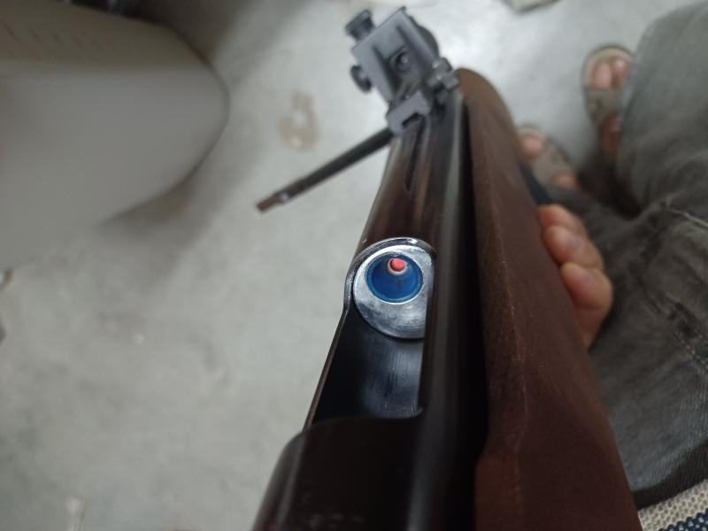 BSA Spitfire 4.5mm , con Silenciador y Diopter. PCP que parece carabina de quiebre y en parte lo es (se quiebra un poco el cañón para cargar) tiene una microfuga que de un día a otro baja de 200 a 190 bar, pero no he buscado. Cargada hace más de 50 disparos a pesar su pequeño depósito.