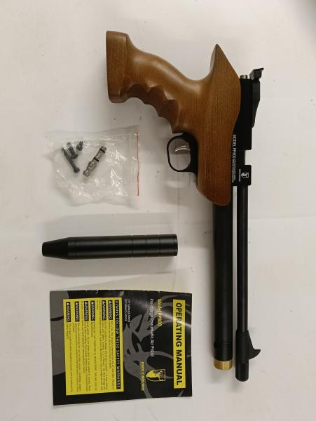 Incluye silenciador de origen y, dado que la empuñadura original (madera) es grande para la mano de mi hija, regalo empuñadura mas pequeña (plástico negro) con culatín desmontable.