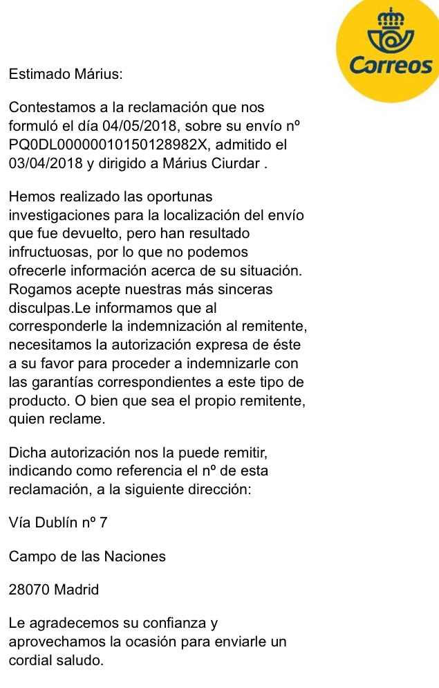 3.- Si el paquete se hubiera perdido y fue enviado por correo certificado, tienes derecho a unos 40 euros de indemnización. Pero me temo que el paquete no se ha perdido, sino que ha sido devuelto y lo tiene el remitente en su poder. Es una elucubración, pero que se puede dar perfectamente.