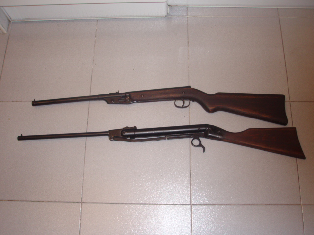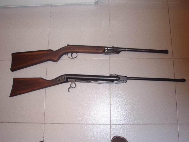 La primera es una DIANA , llevada a su mínima expresión, eso si. A pesar de sus años funciona perfectamente y goza de una buena pegada y precisión dentro de sus límites. La he probado a 8 metros y doy fe. (mi hermano también, no da fe por que no está presente).