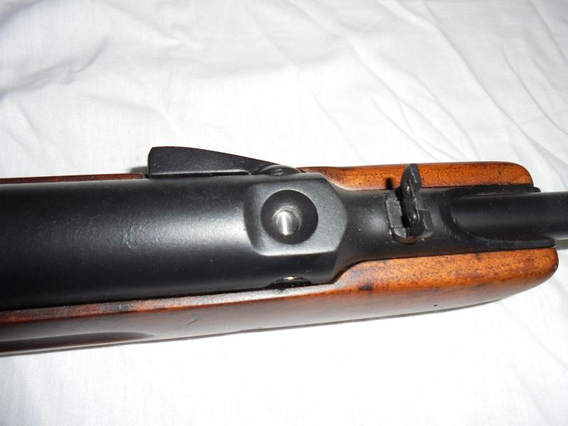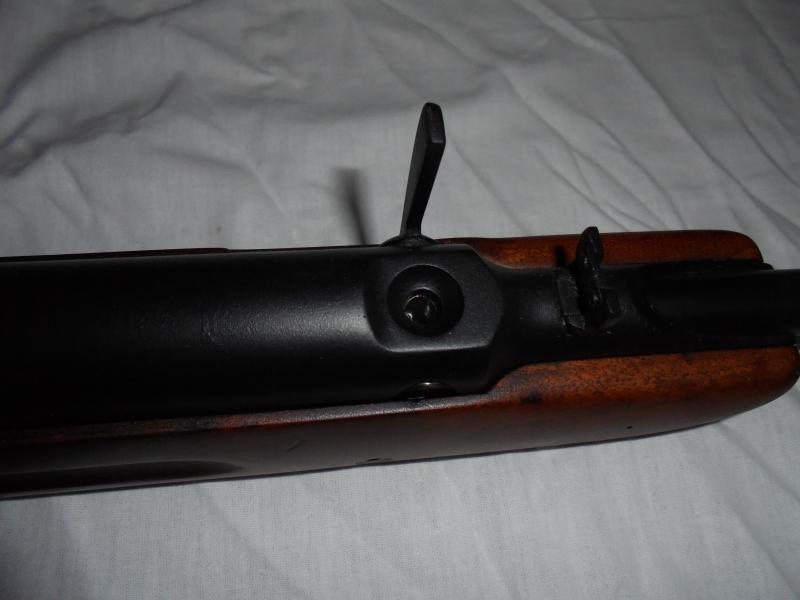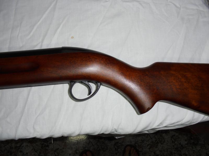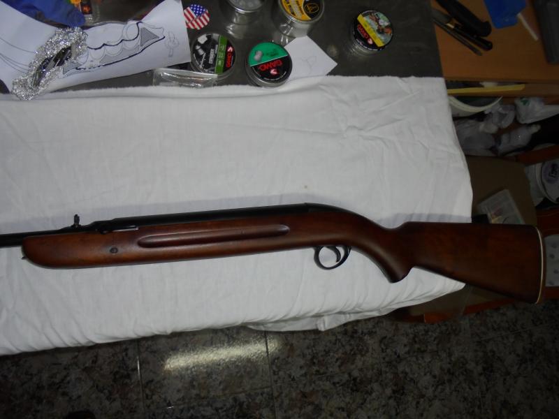 Buenos dias, compañeros, pues un buen amigo, que por la edad está totalmente reñido con la informatica, me pide que le ponga a la venta esta carabina, en calibre 5,5, carga por palanca, está bastante bien de madera, pero por los años, el metal estaba oxidado y la solución que le dio este hombre fue lijar y pintarlo con spray negro, la verdad es que para esta carabina es un pecado, pero como no sabia ni podia hacer otra cosa :evil: :evil: , en fin, como digo, para el tiempo que tiene está muy bien, funcionando perfectamente, y con bastante potencia, tan solo alguna vez, al bascular la palanca de carga, no engancha a la primera y engancha a la segunda, lo pongo para que se sepa todo acerca del estado de la carabina.