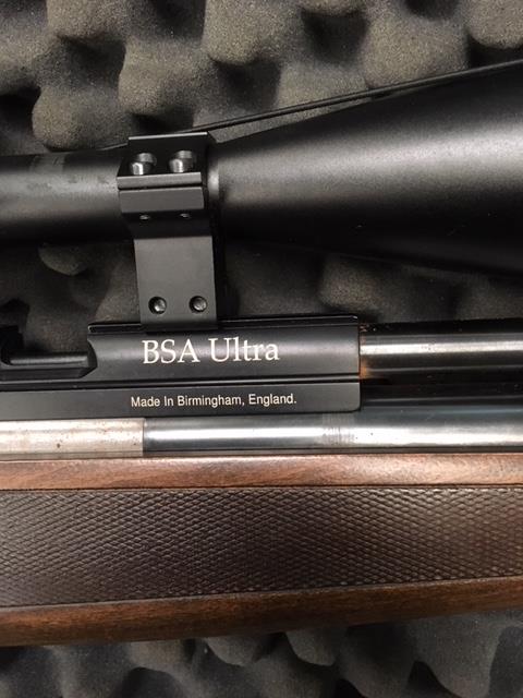 - carabina PCP BSA HORNET ultra calibre 5,5, con depósito de carga largo de gran capacidad. Embellecedor de aluminio en extremo del cañón. El visor es un gamo 24x50