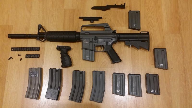 Replica de airsoft del XM177 fabricada por Classic Army. Fullmetal, usada solo para displays. Funciona perfectamente. Incluye los cargadores mostrados. Los cortos son Midcap Marui. Los largos Star, Marui y otro del que desconozco la marca. Los afustes para los visores son militares NO replicas (¡!). Uno es para cualquier tipo de visor con Ras y el otro es para el visor Trilux británico. El pistolete es de fabricacion militar israelí. El Ras y los tornillos son militares. Precio: 360 euros.