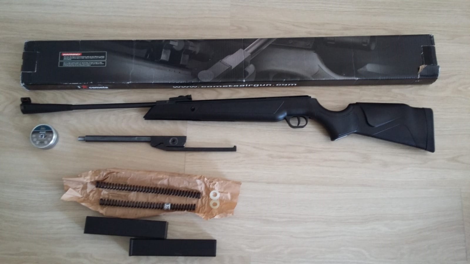 Tiene montado un cañon nuevo de Cometa Fenix en 6,35 más su cañon original de 5,5 con la punta roscada por tornero con rosca 1/2" UNF para acoplar moderador standard. Da unos 22J y se entrega con más muelles y zapatas nuevas. 105€.