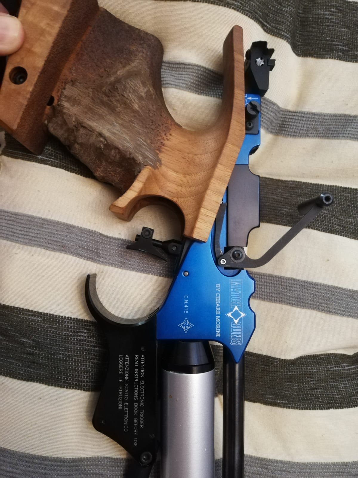 Muy buenas, vendo esta pistola por todos conocida, ES LA QUE VIENE EN EL MALETIN NEGRO(versión mejorada) la envié el mes pasado a Pablo García de Ibergrips, la ha repasado y la ha dejado como nueva, cambiando juntas, etc,etc. La pistola va de maravilla, funciona perfectamente y el disparador tanto electrónico como mecánico son excelentes, sin arrastre y con liberación muuuy limpia, se entrega con una empuñadura M que se le agregó pasta morini (se puede quitar) una de las botellas de aire tiene unos pequeños roces ya que mi hija la usó un tiempo con soporte, no afecta en NADA a la integridad de la misma, caducan en el 2024.