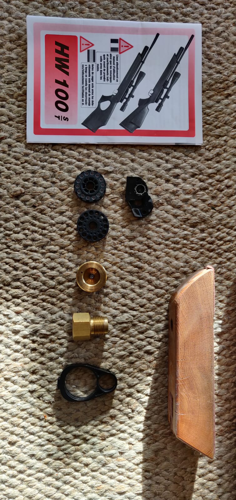Lleva un accesorio para ponerle una carrillera encima de la cantonera si se quiere tirar en Field Target, y otro accesorio para ponerlo debajo de la carabina para apoyar encima de la rodilla o como soporte para tirar en Field Target.