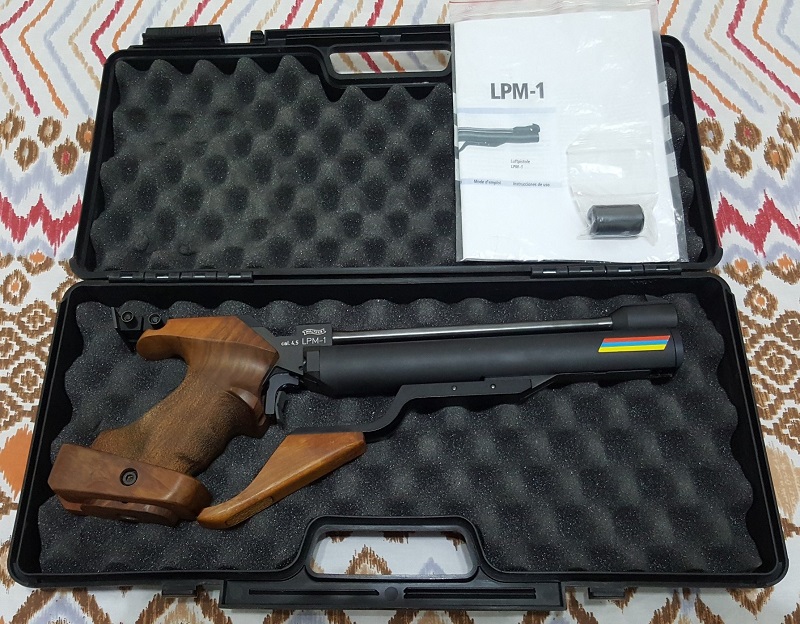 Vendo Walther LPM-1, versión pavonada, en un estado excelente, sin marcas o arañazos, pistola de sistema de aire precomprimido manual (SSP en sus siglas en inglés), no necesita bombona, con empuñadura sin retocar, talla M de diestro y ángulo ajustable, y como extra un contrapeso de 60 gm.