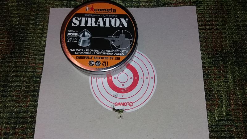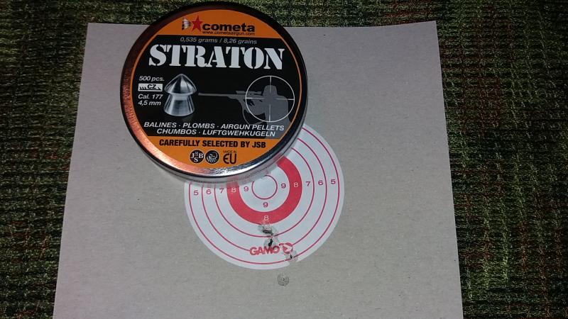 Ahora dispara como salida de fábrica, con balín cometa straton y H&N match rifle (de todos los que se ha probado son los que agrupan mejor) saca 7 julios de potencia y 615 fps de velocidad en boca (187 m/s). Entrego muestras de ambos.