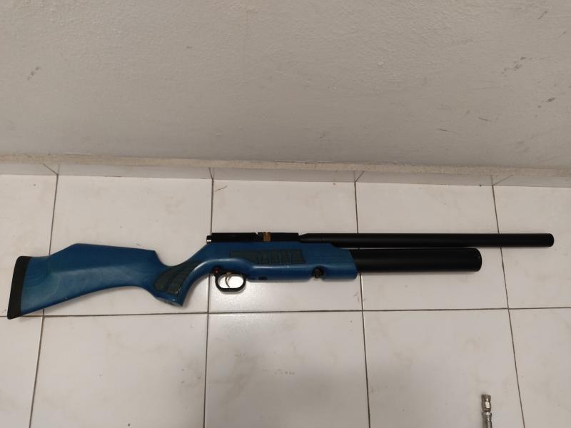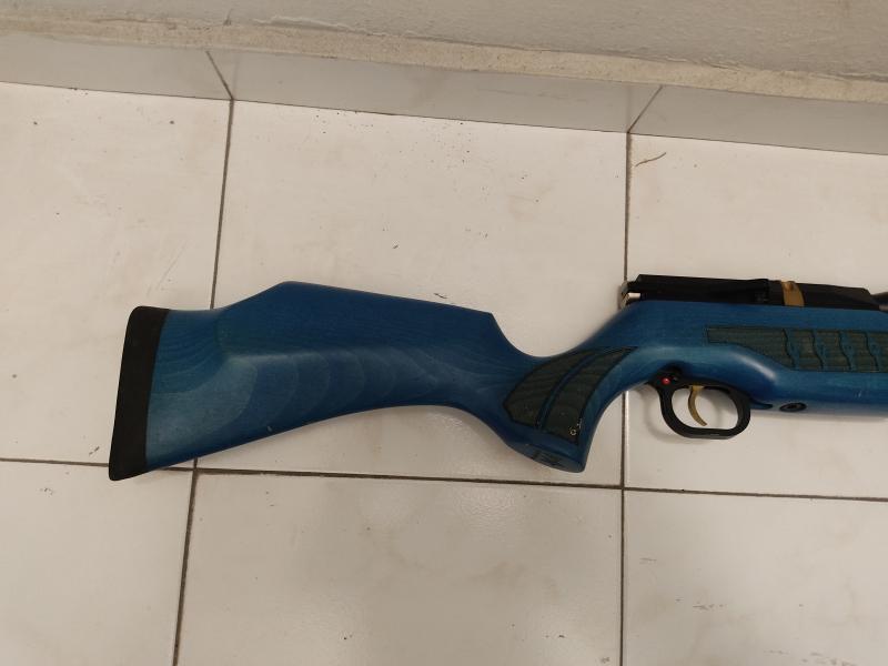 En calibre 5, 5 mm. Madera de color azul. Lleva una bomba Hill. Se envía. O recogida en mano en Vizcaya.
