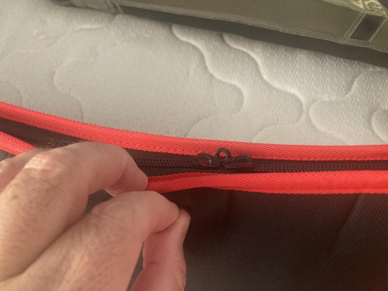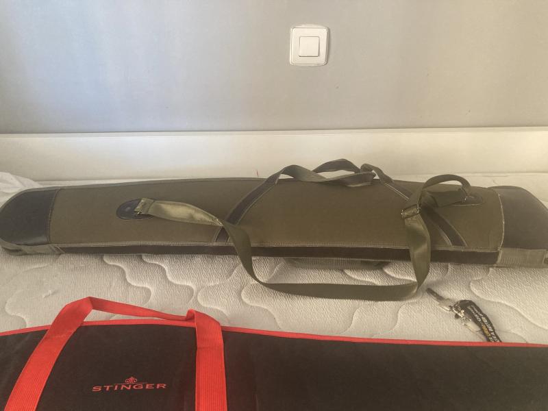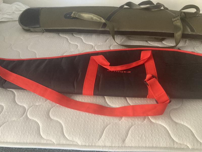 Funda para carabina con visor 125 cm de la marca Stinger, fabricada en tejido resistente y acolchada en el interior. Cremallera de doble carro (los tiradores de la cremallera se han perdido pero la cremallera está perfecta)Bolsillo exterior con cremallera para documentación. Asa y correa de transporte. Color: rojo y negro.
