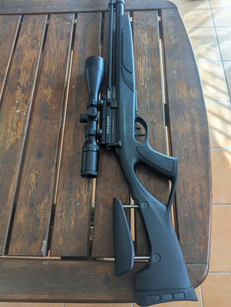 Gamo coyote, calibre 5,5 con visor gamo 3-12x56, la carabina tiene una semana, se compró y se cambia por no adaptarme al pcp. 375€