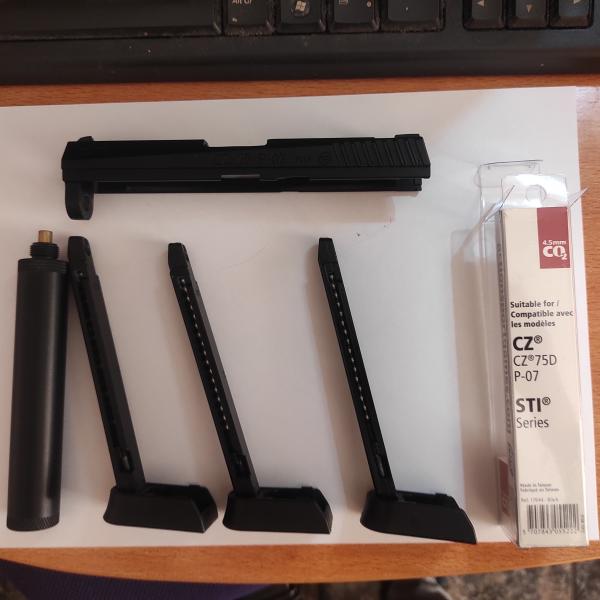 Tiene accesorios, silenciador,dos cargadores mas adicionales y otra corredera en negro.