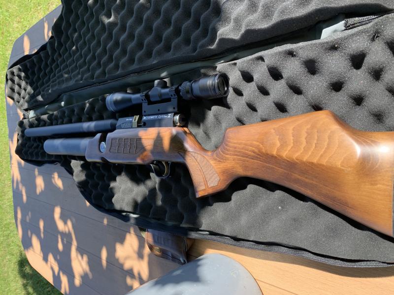 Consta de, carabina Cometa Lynx calibre 5,5 (.22), visor de la imagen, botella buceo, bomba Hill, funda y balines.