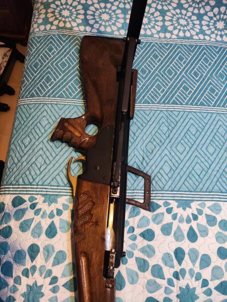 Es una carabina artesanal bastante pesada (unos 7'5kg), con culata hecha a mano artesanalmente, el sistema de carga es de palanca, tiene adaptador para visor y calibre 6'35.