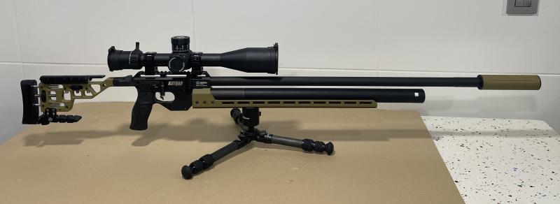 Carabina Katran NX HP Olive calibre 5,5 con visor Element titán 5-25x56 FFP y anillas, ademas tiene los siguientes extras: tirador de carbono, supresor Olive en combinación con los colores de la carabina, bag rider + monopie específico para Katran. 1700 € envío incluido