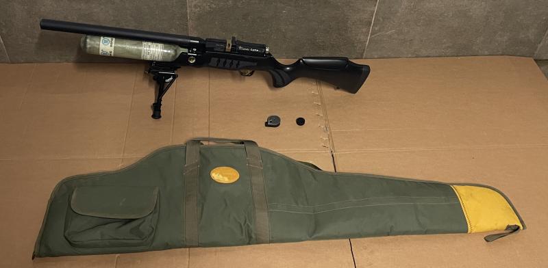 Carabina cometa Lynx en madera negra, calibre 5,5. Tiene como mejoras botella de fibra, regulador cometa F-300B, cargador monotiro meplan, funda cometa para carabina con visor, bipode y adaptador carril picatiny para el mismo. El regulador lleva puesto un mes al mismo tiempo que se revisaron y cambiaron juntas. Se puede vender sola o con visor depende el interés. 700 €
