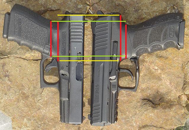 Para mí, el gran problema de la USP es que la zona marcada sobresale demasiado, si se pudiese recortar y que la horquilla de la mano quedaraún poco más alta, quedaría un arma de PM. Igual le quitaría algunos clientes a Glock.