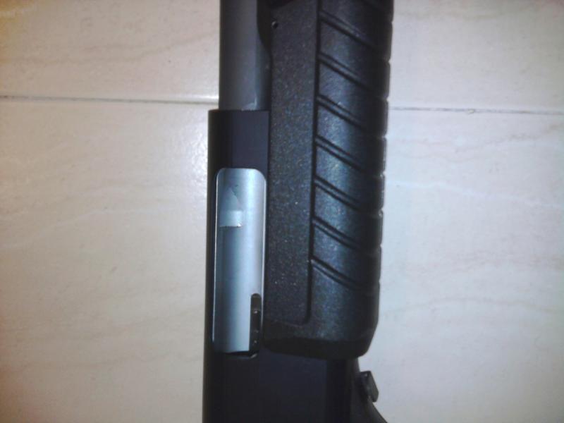 Bien aqui te cuelgo unas fotos de lo que te explico, la corredera o guardamanos llega a tapar totalmente la rampa de alimentacion por debajo, la ventana por el lado derecho y si observas detenidamente en la segunda foto se aprecia la distancia desde el bulón o pasador de la caja de mecanismos a la corredera, creo que no tendras problemas para ponerlo (portacartuchos), de paso cuelgo una foto del resultado de momento final hasta que me haga con pasta para el red dot.
