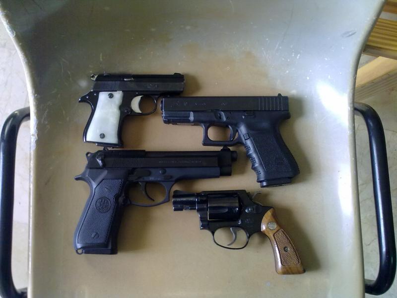 Supongo que la Beretta es tu arma reglamentaria. La glock 19 es, a mi entender, de lo mejor que uno puede encontrar en 9 mm, el S&W es "el snubbie" por excelencia y solo faltaba que tuvieses una walther ppk...aunque esa Star no está nada mal (lo de las cachas blancas quizá que no me va mucho, pero se ve un arma muy cómoda de llevar).
