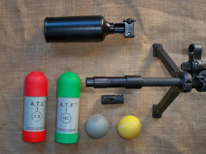 Los acoples ésos sirven para el lanzamiento de pelotas de goma y de fumígenos, se acoplan al cañón del arma mediante el procedimiento de sustituir la bocacha por un acople específico sobre el cual se sujeta el lanzador mediante una especie de abrazadera.