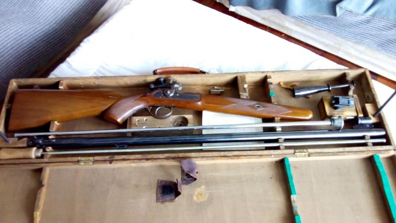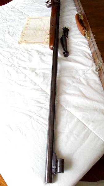 Vendo rifle Rigby Creedmore Match Cal. 451, fabricado por el taller AMR Antonio Marcos Relea en Eibar. Cañon estriado ondulado especifico del Rigby, paso de vuelta (1/20), longitud total 1,24 y 83 cm de cañon. Con embudo de carga de aluminio, baqueta, un alza regulable , Diopter , túnel con alguna anilla , alguna chimenea mas y estuche rigido artesanal en madera con soportes para poder trabajar en el arma, . En buen estado de conservación solo 2 dueños y siempre mimado aún conserva el certificado de fabrica .