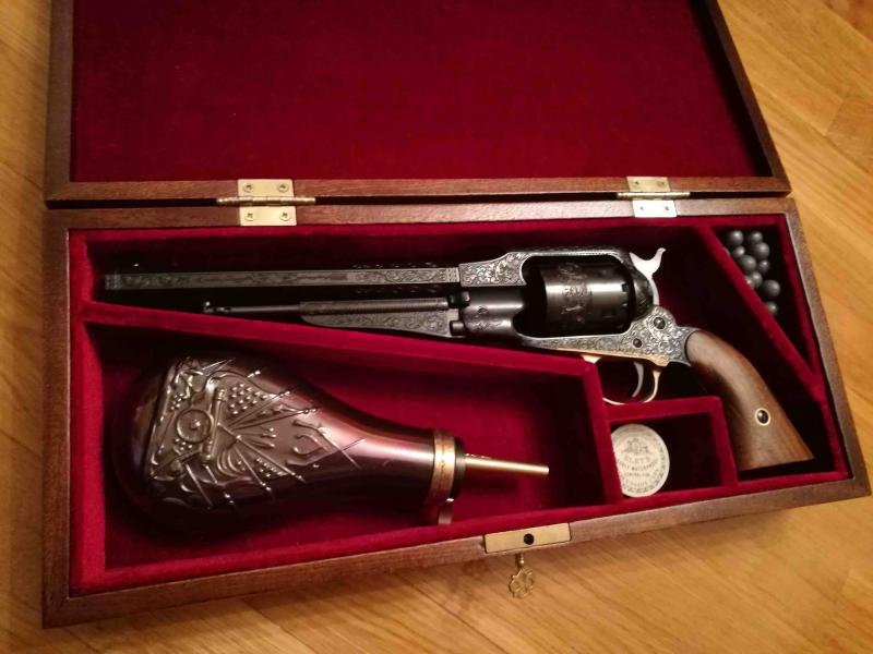 Yo he tenido el placer de recibir dos estuches, uno para Colt Army 1860 y otro para un Remington 1858 (una réplica Centaure el primero y un Uberti burilado el segundo).