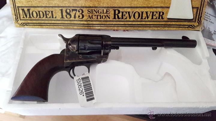 Revolver pietta model 1873 single action. cal. 45lc longitud 7″1/2 (190mm) . tambor de 6 balas . pavonado Azul, cachas de madera. usa pólvora negra,arma de cartucho metálico guiada EAR
