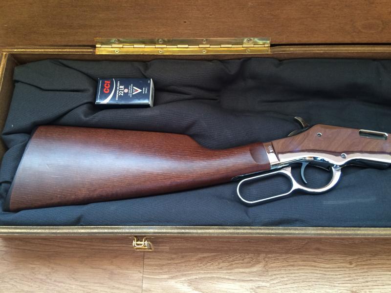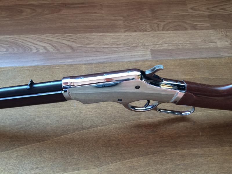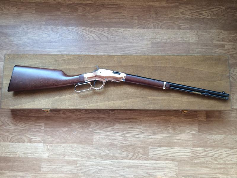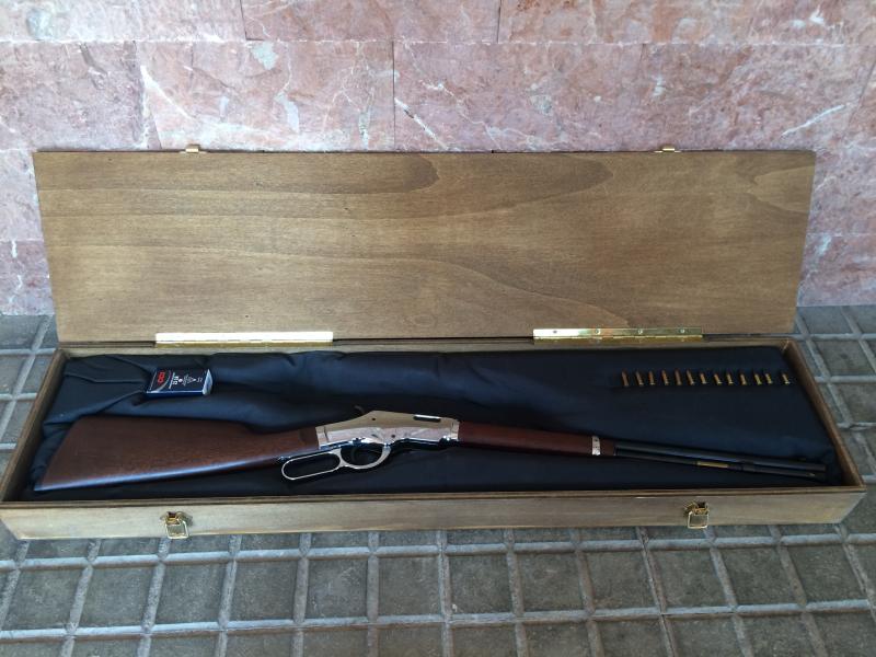 Carabina calibre . 22LR de palanca, marca Uberti Silverboy. Réplica de Winchester 1873 y guiada en AE. Tengo certificado del BOPE con catalogación de arma antigua. Comprada nueva hace 4 años como capricho, no ha tirado más que 2 cajas de balas. Muy precisa y bien hecha, una gozada disparar con ella. Todo en perfecto estado: maderas, metales, mecanismos y cañón. Cargador tubular de 15 balas.