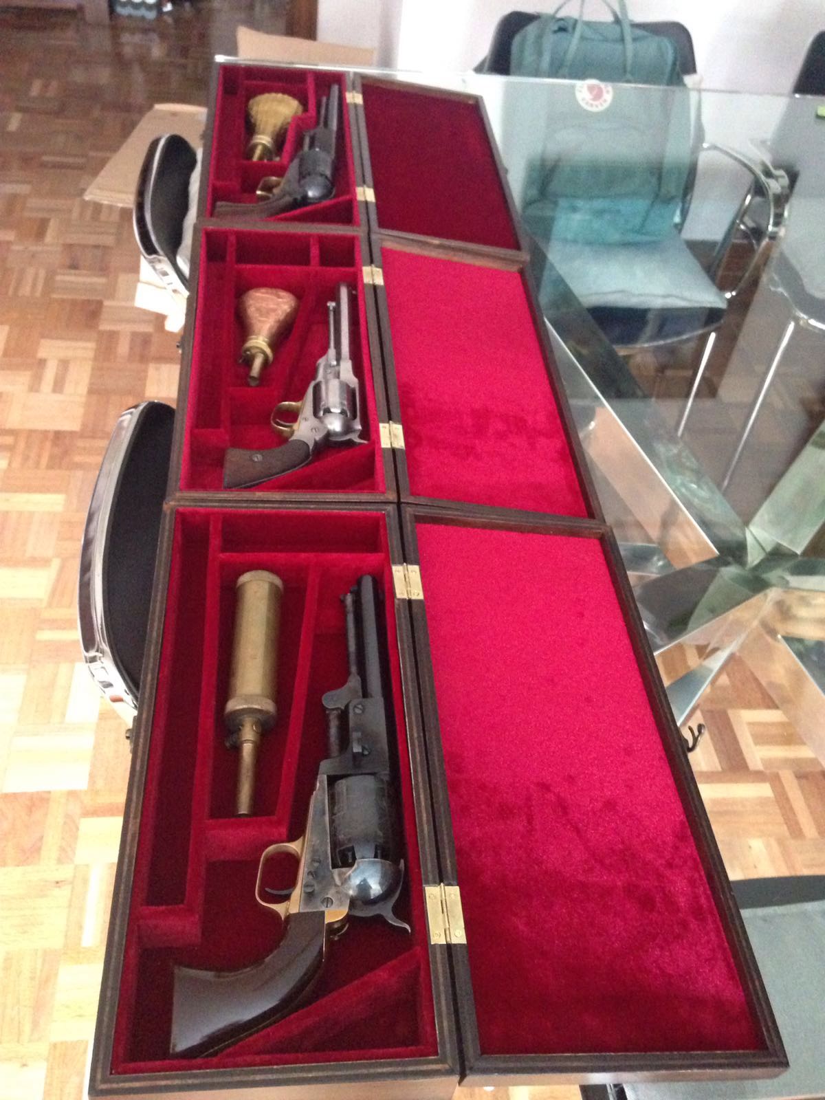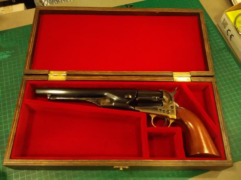 Hago cajas para revólveres REMINGTON 1858, COLT SAA, ARMY, NAVY,WALKER,DRAGOON. También pistolas de duelo, MANG IN GRAZ, HEGE UBERLINGER, UNDERHAMMER y en general cualquier arma corta. Por encargo y al gusto del consumidor, con los departamentos y tamaño que quiera.
