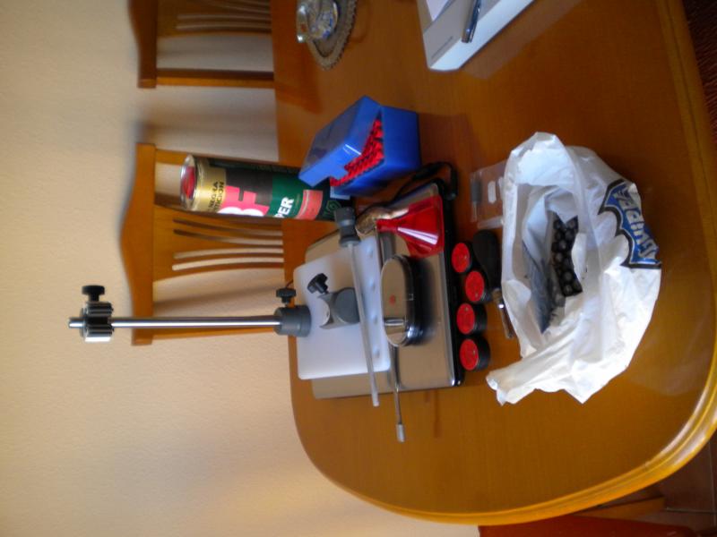 Accesorios: Banco de carga de un tipo de material muy resistente, no sé si polímero, con barra de acero inox. (no aluminio), con todo tipo de ajustes. Muy bien hecho. Medio kilo de pólvora negra (le faltan los 50 disparos) Dos embudos, uno corto y otro largo, una baqueta con mango de asta de ciervo, balanza de precisión, dos llaves de chimenea, un sacproyectiles, una aguja limpia chimeneas, 4 cajas de pistones, 40 dosificadores y su caja y unas ciento y pico de bolas de plomo.