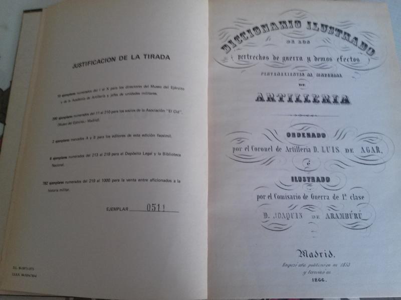 Diccionario Ilustrado de Artillería, ISBN 84-500-6780-4 Edición en 1975 del publicado en 1853, numerado 0511 de 1000. precio 75€ VENDIDO
