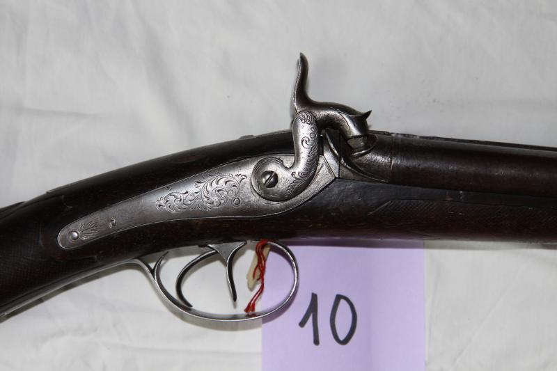 Escopeta de caza de avancarga, de dos cañones. Muelles reales interiores y traseros. Mecanismo de pistón.