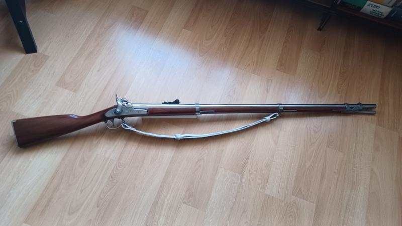 Buenas a todos. Se trata del 1847 con cañon estriado, derivado del 1842 de ánima lisa. Calibre 69. Puede disparar tanto bala minié o bola, pero no sé lo bien que dispara porque jamás lo estrené. Es el ultimo arma de avancarga que compré antes de pasarme a la pólvora sin humo, y ha estado colgado de adorno en la pared.