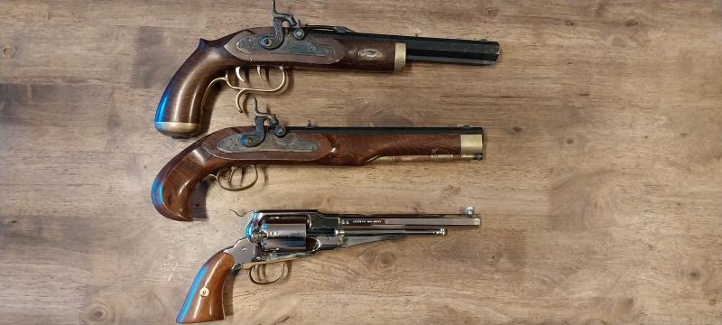 Vendo revolver pietta inoxidable, con algún toque estético pero mecánicamente perfecto. Según recuerdo tira bajo pero centrado. Subo foto de las chimeneas desmontadas. Le acompañan dos pistolas que necesitan una restauración profunda. Una de ellas tiene una bola metida (sin polvora). Las compré ya así y no me ha dado tiempo de arreglarlas. Me quitto toda la avancarga.