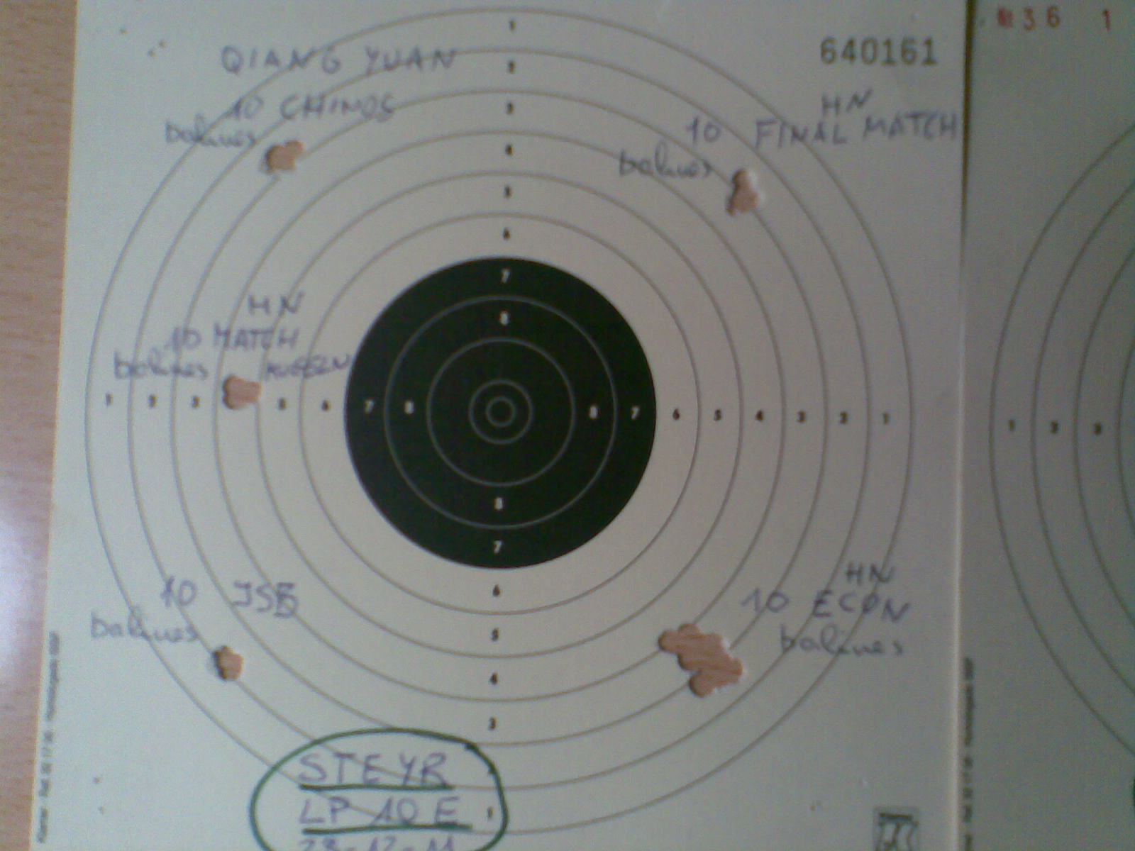 Hola. Supongo que muchos de los tiradores de precisión aire a 10 metros nos hemos preguntado con qué marca de balines deberíamos tirar para agrupar más y mejor y subir de puntuación. Sin ánimo de menospreciar las demás marcas de balines, hice unas pruebas con las pistolas sujetas a un banco de trabajo y el resultado es el que observáis en las fotos. Se dispararon 10 con cada marca, eso sí moviendo el blanco, como es de suponer y la diferencia entre las rosas de tiro las podéis apreciar más o menos claramente. Las pistolas utilizadas son steyr lp 10 e y morini cm 162 ei. Espero aclarar alguna duda sobre los balines con esta prueba porque existe diferencia de precio entre unos y otros. Un saludo.