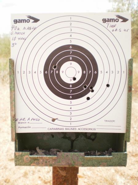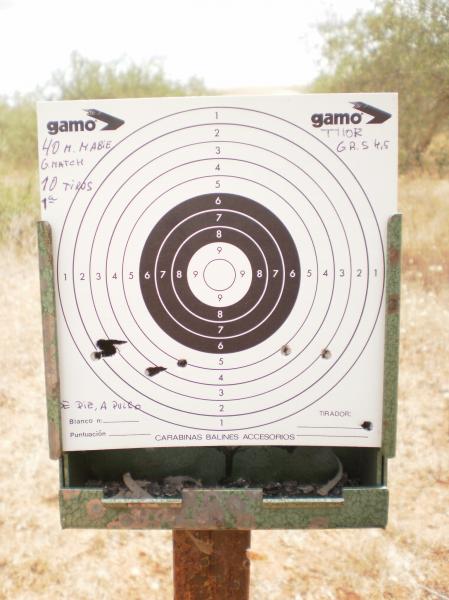 Bueno,pues la prueba ha sido ni mas ni menos que divertirme un rato.He tirado a 40m de pies,a pulso.La carabina una Thor GRS ya conocida.Han sido tres tandas de diez disparaos cada una,como así lo señalo.