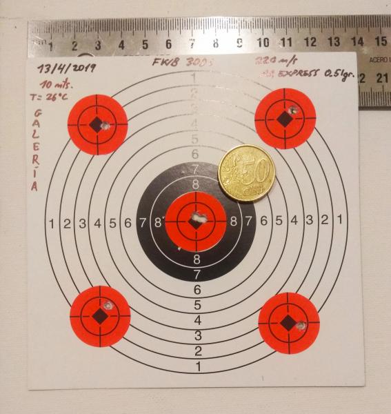 El producto estrella, que es la carabina, pues hace como 30 años que ya no se fabrica, una Feinwerkbau 300 S Universal, la mejor carabina de muelle jamas construida, y el tope de gama de aquellos tiempos, y que costaba de aquella, en la década de los 80, unas 120.000 pesetas, y un salario mensual decente, eran unas 25.000 pesetas....no es muy fácil de encontrar así por las buenas, y ojo, que la carabina de serie, era de 7,5 Julios, y aunque le metas el muelle tuning, no pasa de los 10 Julios, y lograr esas agrupaciones a 50 m, no es ninguna coña.....