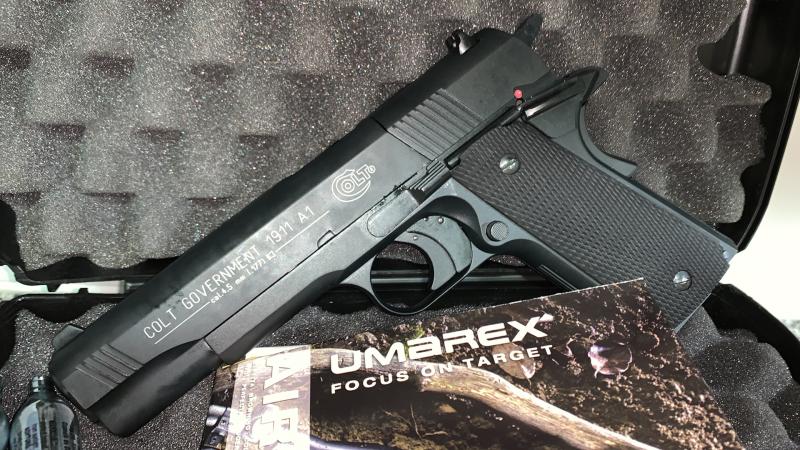 Una Colt 1911 A1 fabricada por licencia por UMAREX en Alemania. Dispara perdigones de plomo de 4,5 mm. Digamos que es el tope de gama en este tipo de armas. Totalmente de metal, peso igual que la original, mismos tipos de seguros tanto en empuñadura como en corredera, además en bastante potente obteniendo una media de 120 metros por segundo en 60 disparos y bastante precisa a 10 metros (eso si por ahora con dos manos).