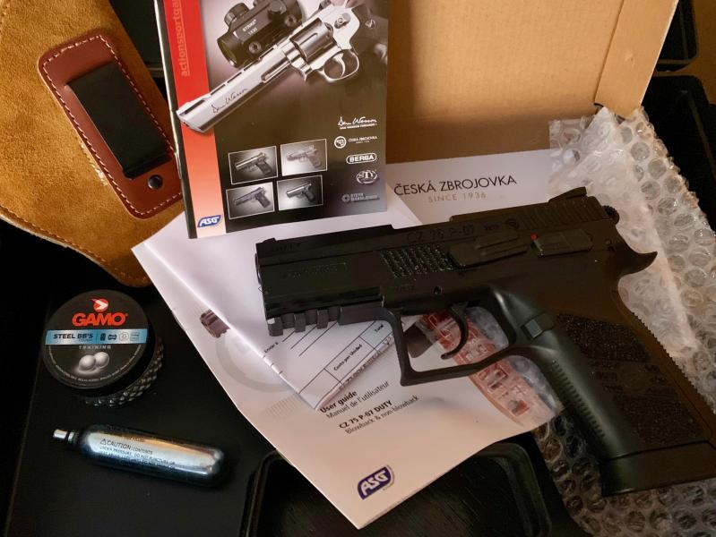 Una Ceskà o CZ 75 Duty. Fabricada por ASG con licencia de CZ. Dispara bbs de acero de 4,5 mm. Fabricado el carro en metal y el resto en polímero, lo que la hace liviana y compacta si la comparamos con la 1911. Sistema blowback, es decir, la corredera se mueve con cada disparo y se traba con el último. Capacidad de 20 balines. Es menos precisa y potente que la Colt y digamos que es gama media. Pero muy divertida.