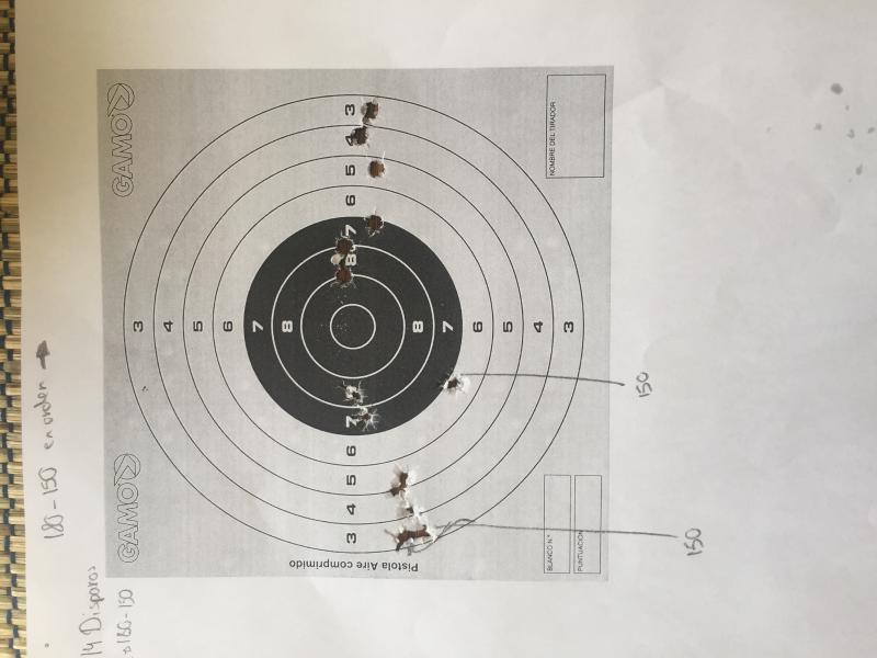 Como podeis ver en la diana he apuntado los disparos que hay, 14, dos de ellos son post prueba que son los que estan señalados en la diana con un 150, todos van en orden de izquierda a derecha apuntando a los numeros de la dianay un tiro a cada numero, osea desde el 3 de la izquierda hasta el otro 3, con el deposito a 180 bares y la mira centrada solo que ya se me habian bajado los tiros antes, los primeros muy bajos de 1-2cm, los disparos correspondientes al 7,8,8,7 van bien pero los siguientes vuelven a bajar, acabo esta ronda con 150 bares en el deposito, volvi a tirar ( los 2 tiros post prueba y bajaron a la altura de los del principio.